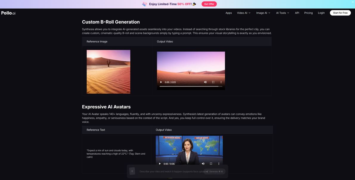 Pollo AI supports seamless avatar-based video generation. For more dedicated avatar workflows, tools like Synthesia’s AI avatar video maker offer specialized presenter customization — a useful complement depending on your use case.