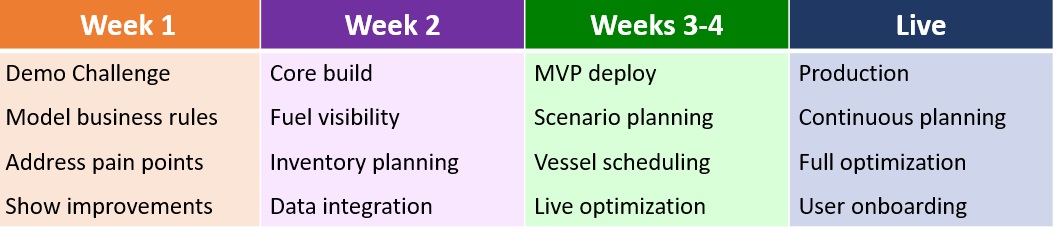 One of the most common objections fuel organizations raise when evaluating planning platforms is the implementation timeline. Enterprise software projects with 12 to 18 month go-live windows are not attractive when the planning problem is urgent today.
